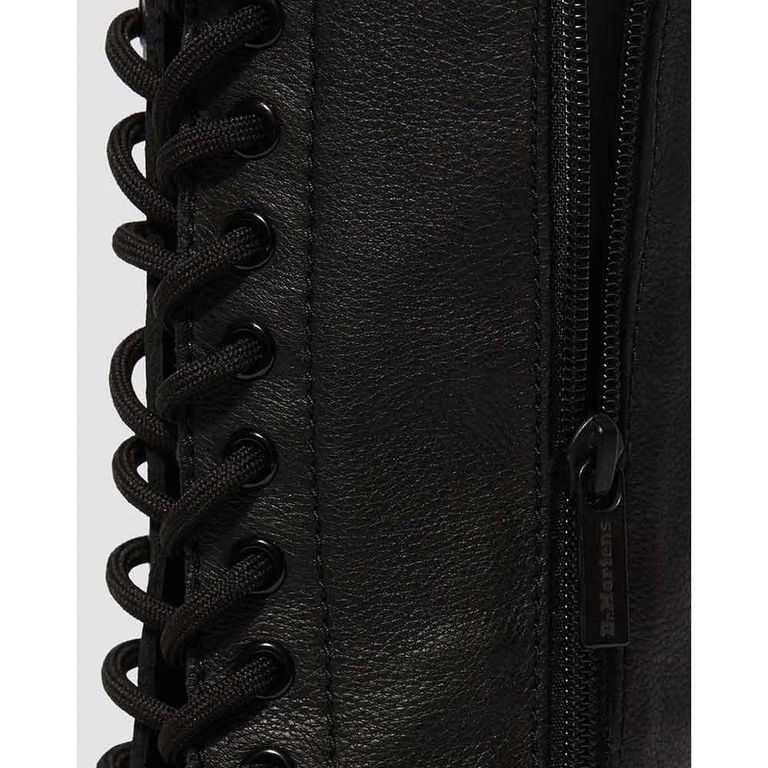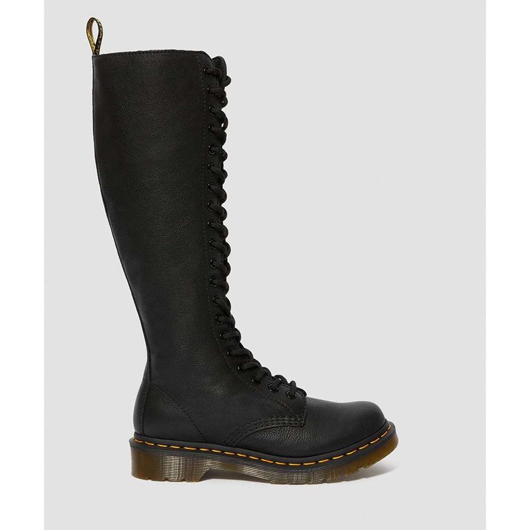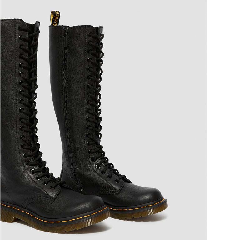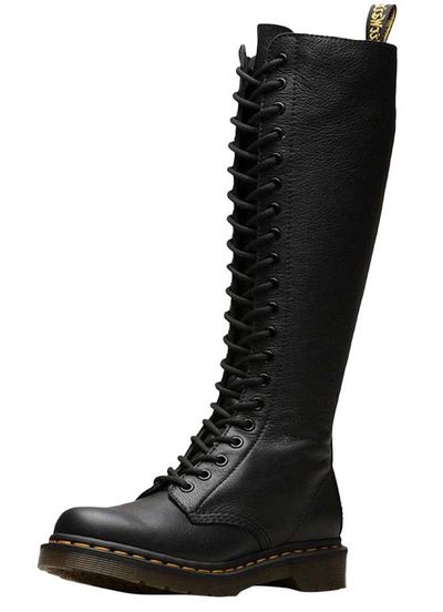 Черный цвет этих ботинок делает их универсальным элементом гардероба, который легко сочетать с любой одеждой – от классических джинсов до дерзких кожаных курток. Высокий силуэт и 20 рядов шнуровки придают обуви эффектный и дерзкий вид, который непременно привлечет внимание.